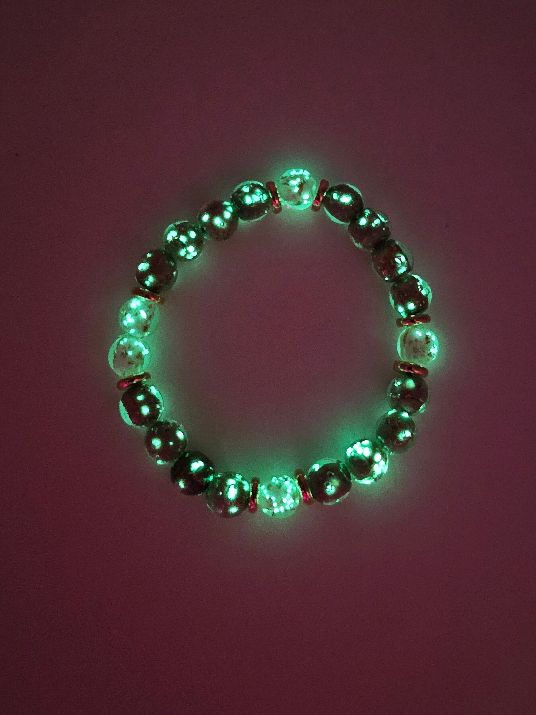 Handcrafted with luxurious 8 \text{ mm} lampwork glass beads in soft purple and creamy white, finished with gold-tone spacers. This elegant piece reveals its secret after dark, glowing with a striking, ethereal light.
