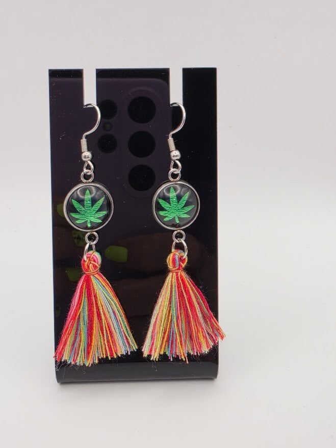 Celebrate good vibes with these striking handcrafted earrings from Vibe Wrap Sensation. This design features a vibrant green cannabis leaf set against a deep black background, highlighted by a colorful, multi-toned rainbow tassel.
