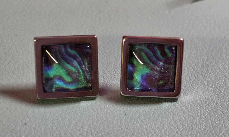 Capture the magic of the night sky with these "Aurora" square stud earrings from Vibe Wrap Sensation. Each earring features a mesmerizing swirl of emerald green, deep violet, and shimmering teal, reminiscent of the Northern Lights.