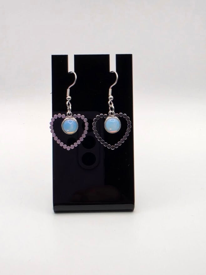 Capture a soft, celestial radiance with our "Moonstone Glow" heart dangles. These earrings feature a mesmerizing, translucent milky-blue center that catches the light with an opal-like shimmer, all held within a decorative beaded heart frame.