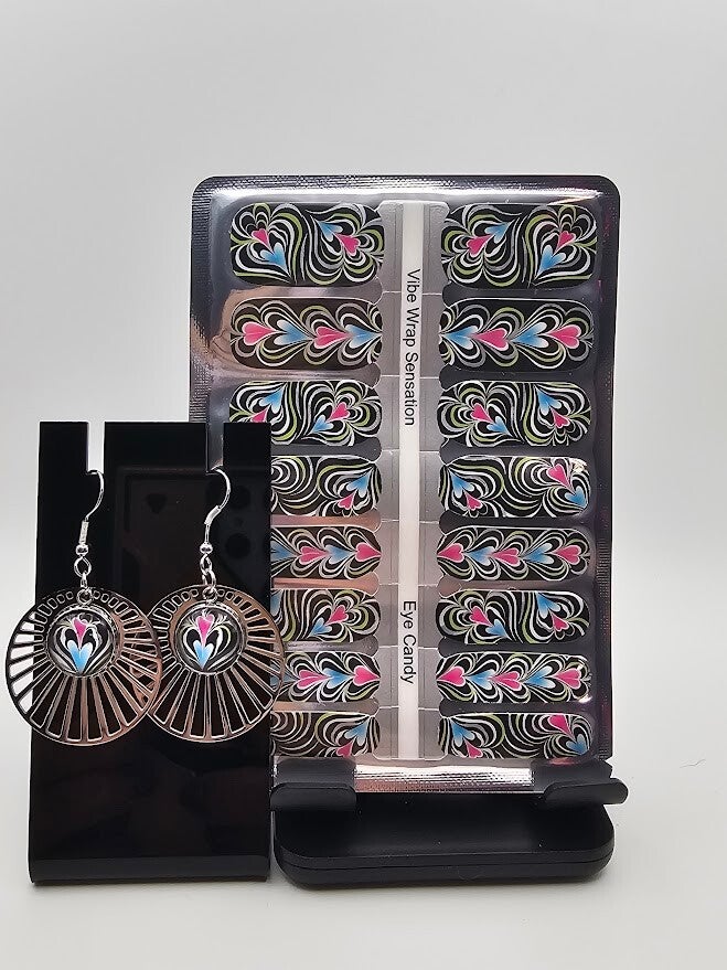 Why choose when you can have the perfect pair? This exclusive Vibe Wrap Sensation bundle features our popular "Eye Candy" nail wraps and matching sunburst fan earrings. The vibrant tri-color hearts in neon pink, electric blue, and lime green create a cohesive, high-energy look from your fingertips to your accessories.