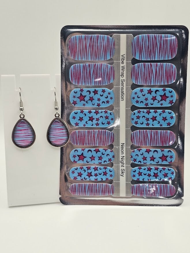 Designed in-house by Vibe Wrap Sensation, both the wraps and the earrings feature an electric blue base with cosmic purple and magenta patterns. The best part? They glow in the dark, making this the ultimate accessory set for concerts, parties, or stargazing.